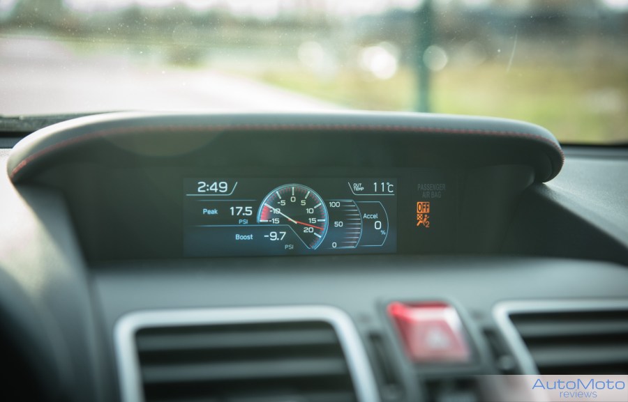 Above the center stack, there’s this little display that shows vitals, boost levels as well as fuel consumption. Being a bit further away in the dash it’s harder to see than liked, so it’s more of a display piece than functional gauge. Although it is cool to see the maximum pressure generated by the Turbo.